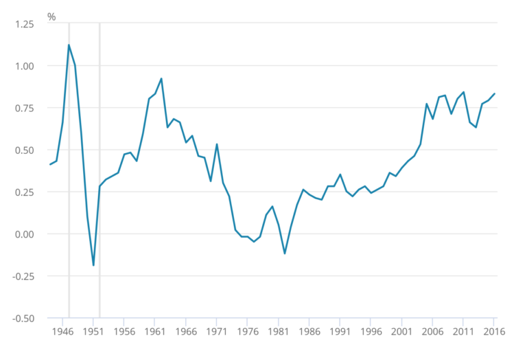 Annual population change for the UK, mid-1944 to mid-2016